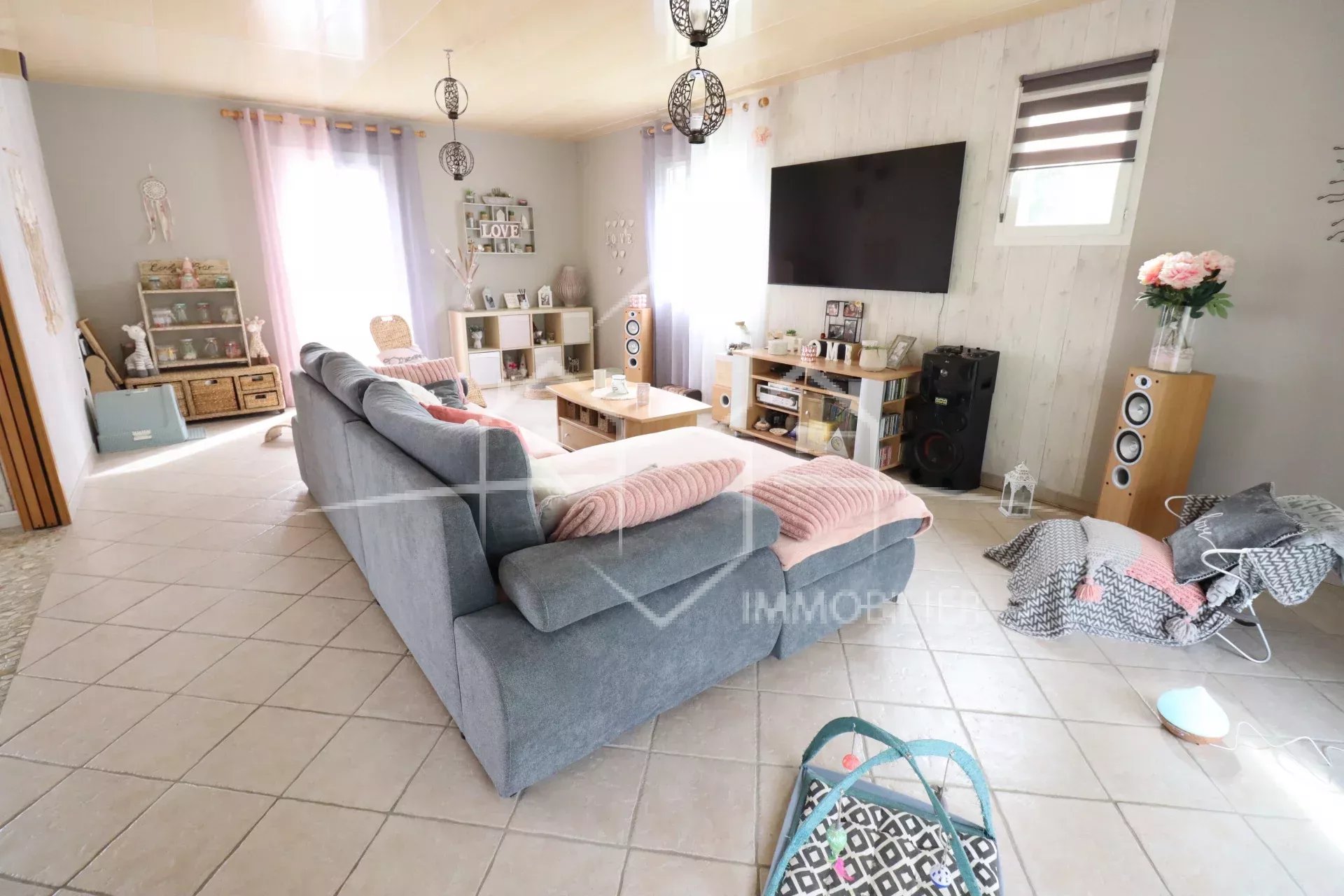 Prestations : Aspiration centralisée, Double vitrage, Fenêtre PVC, Fenêtres coulissantes, Panneaux photovoltaïques, Ventilation simple flux, Volets roulants électriques, Clôture, Éclairage extérieur, Piscine.